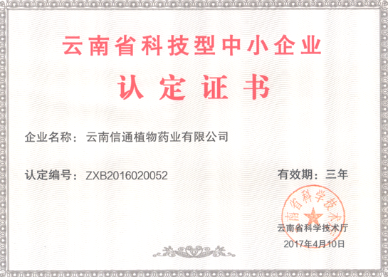 本網(wǎng)訊 云南信通植物藥業(yè)有限公司繼2015年獲云南省科技廳認(rèn)定為 “中藥現(xiàn)代化科技產(chǎn)業(yè)(云南)基地中藥材種植科技示范園”和“云南省農(nóng)業(yè)科技示范園”后,2017年4月云南省科技廳再次認(rèn)定云南信通植物藥業(yè)有限公司為“云南省科技型中小企業(yè)”,6月正式頒發(fā)證書并授牌。