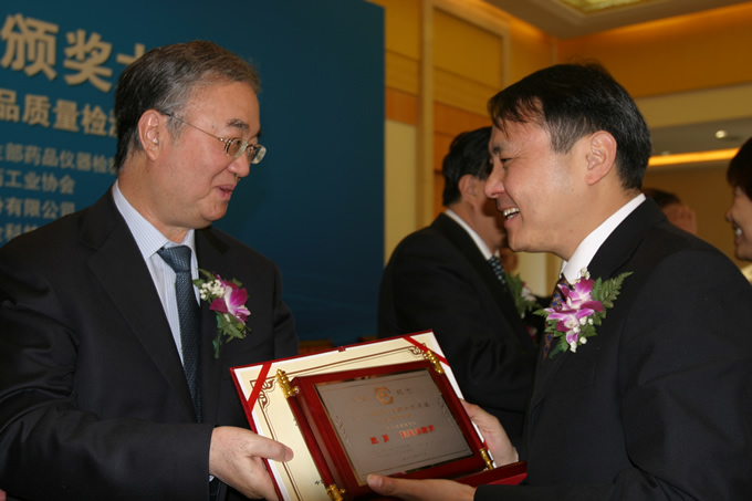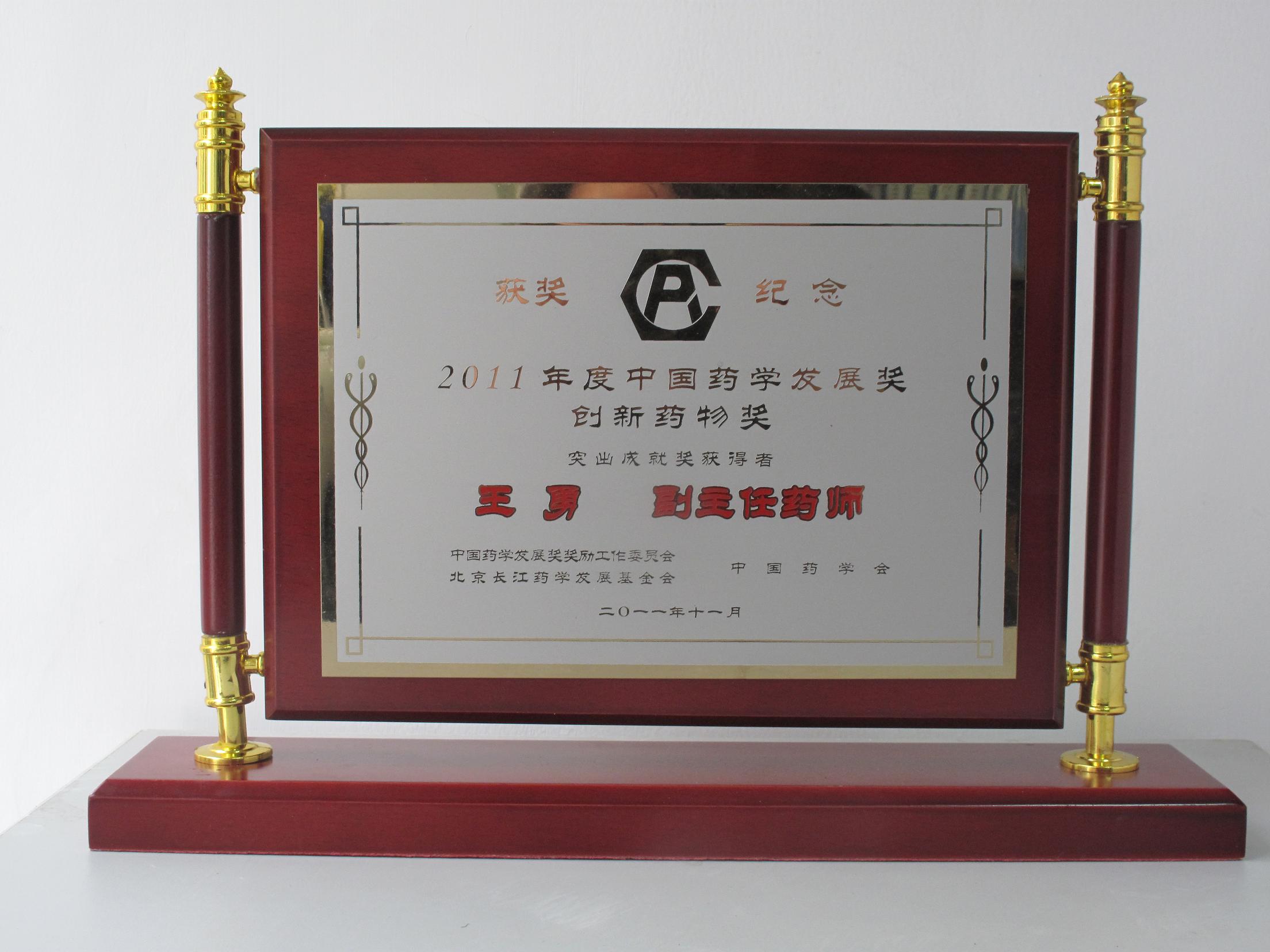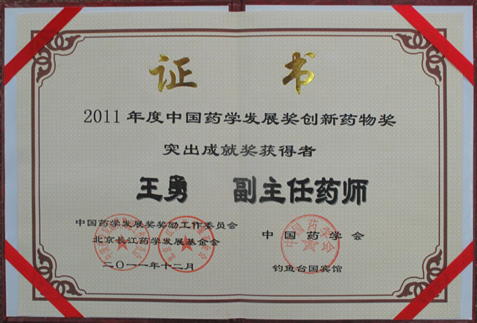本網(wǎng)訊 2011年度中國(guó)藥學(xué)發(fā)展獎(jiǎng)?lì)C獎(jiǎng)大會(huì)12月18日在北京釣魚(yú)臺(tái)國(guó)賓館隆重舉行,我公司王勇董事長(zhǎng)喜獲“2011年度中國(guó)藥學(xué)發(fā)展獎(jiǎng)創(chuàng)新藥物獎(jiǎng)突出成就獎(jiǎng)”,全國(guó)人大常委會(huì)副委員長(zhǎng)桑國(guó)衛(wèi)出席大會(huì),并向王勇董事長(zhǎng)頒獎(jiǎng)。