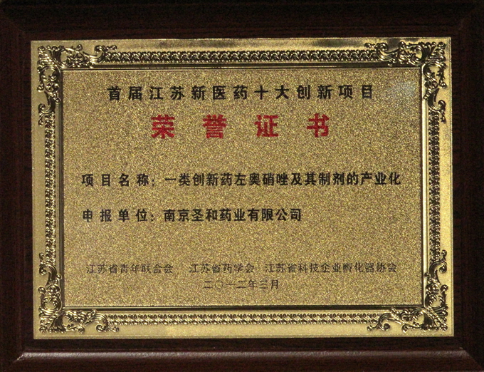 為了深入實(shí)施科教興省和人才強(qiáng)省戰(zhàn)略,促進(jìn)新醫(yī)藥等六大新興產(chǎn)業(yè)的發(fā)展,發(fā)現(xiàn)和凝聚一批青年創(chuàng)新創(chuàng)業(yè)領(lǐng)軍人才,江蘇省青年聯(lián)合會(huì)、江蘇省藥學(xué)會(huì)、江蘇省科技企業(yè)孵化器協(xié)會(huì)聯(lián)合在全省范圍內(nèi)開展了首屆江蘇新醫(yī)藥科技創(chuàng)新創(chuàng)業(yè)項(xiàng)目大賽暨青年科技領(lǐng)軍人才舉薦活動(dòng)。目前,我司申報(bào)的“一類創(chuàng)新藥左奧硝唑及其制劑的產(chǎn)業(yè)化”項(xiàng)目,被授予“首屆江蘇新醫(yī)藥十大創(chuàng)新項(xiàng)目”榮譽(yù)稱號。