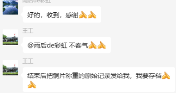 為了更好地說明銅片試驗的重要性,下面分享一個檢測公司的銅片試驗實際案例:2024年8月份合肥******檢測技術(shù)有限公司第一次采購我司一臺型號為“WHQ-300B”型的混合氣體腐蝕試驗箱,設(shè)備被運送到客戶指定的場地安裝調(diào)試運行。安裝調(diào)試后,客戶后期自行進行一次銅片增重試驗,我司技術(shù)人員進行線上指導(dǎo)操作,試驗結(jié)束之后客戶將數(shù)據(jù)發(fā)給我司,以下是客戶和我司聊天記錄以及客戶做的數(shù)據(jù)信息: