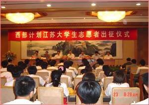 2003年8月23日上午,團(tuán)省委、省教育廳、省財(cái)政廳、省人事廳聯(lián)合舉行江蘇大學(xué)生志愿服務(wù)西部計(jì)劃出征儀式,歡送我省415名大學(xué)生志愿者赴陜西、廣西、云南三省區(qū)貧困地區(qū)鄉(xiāng)鎮(zhèn)基層從事為期1—2年的教育、衛(wèi)生、農(nóng)技、扶貧等方面的志愿服務(wù)。省委副書記馮敏剛,省委常委、組織部長徐國健,副省長吳瑞林出席了儀式。
